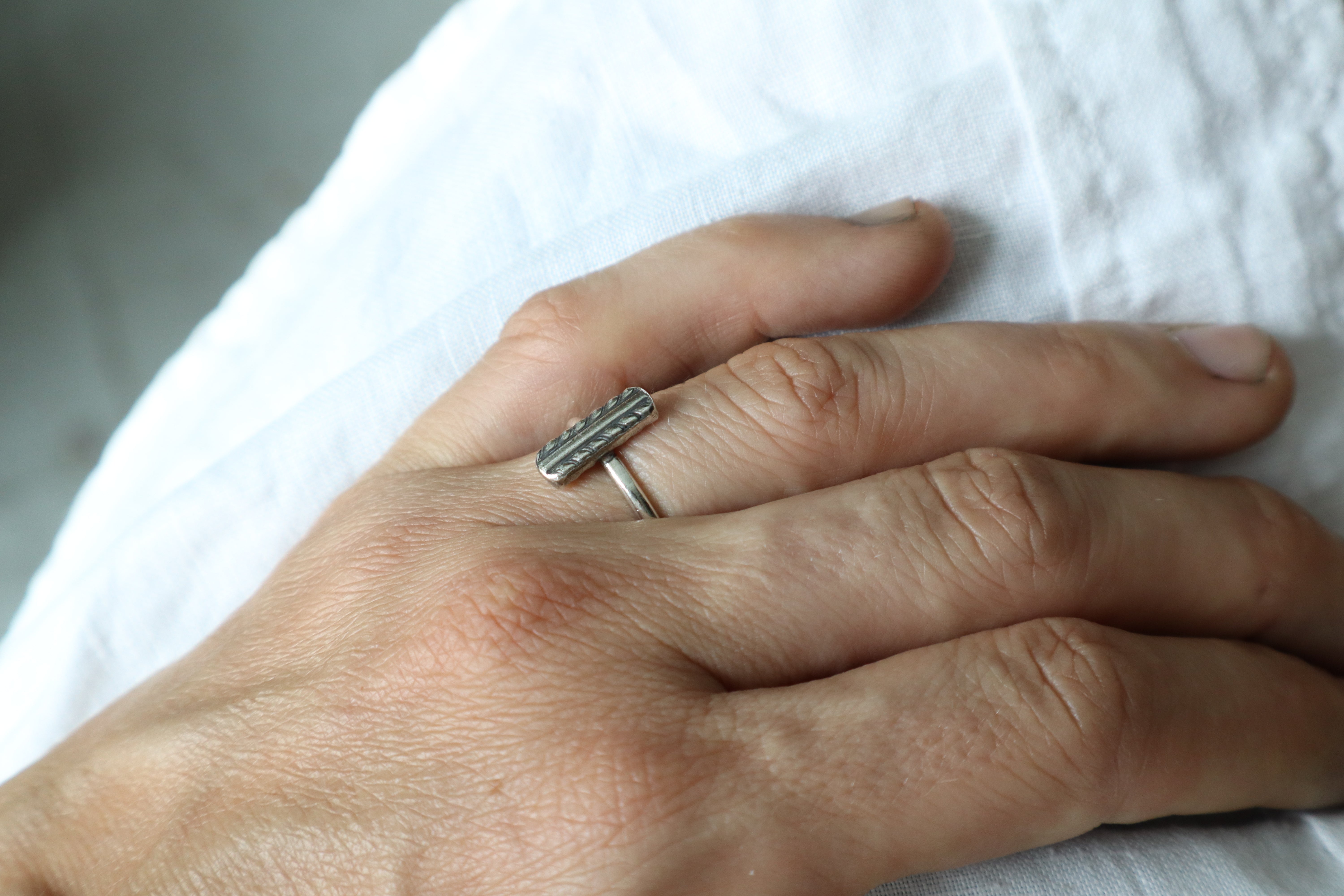 Simple and graphic, Lucinda is a ring for those who like the beauty of simplicity, but with just enough detail to stand out. It is easily worn on its own or stacked alongside other favourites. It is made with repurposed and recycled materials, carrying with it the spirit of resourcefulness and transformation.