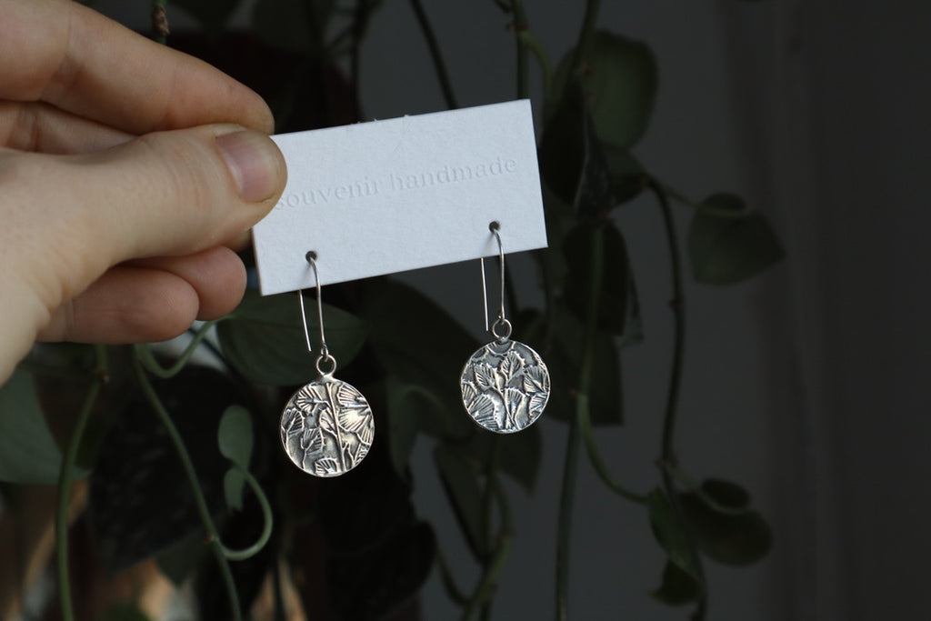 These earrings feature 19mm hand-pressed sterling silver coins on hand-formed ear wires. The coins have a soft texture and natural movement when worn.