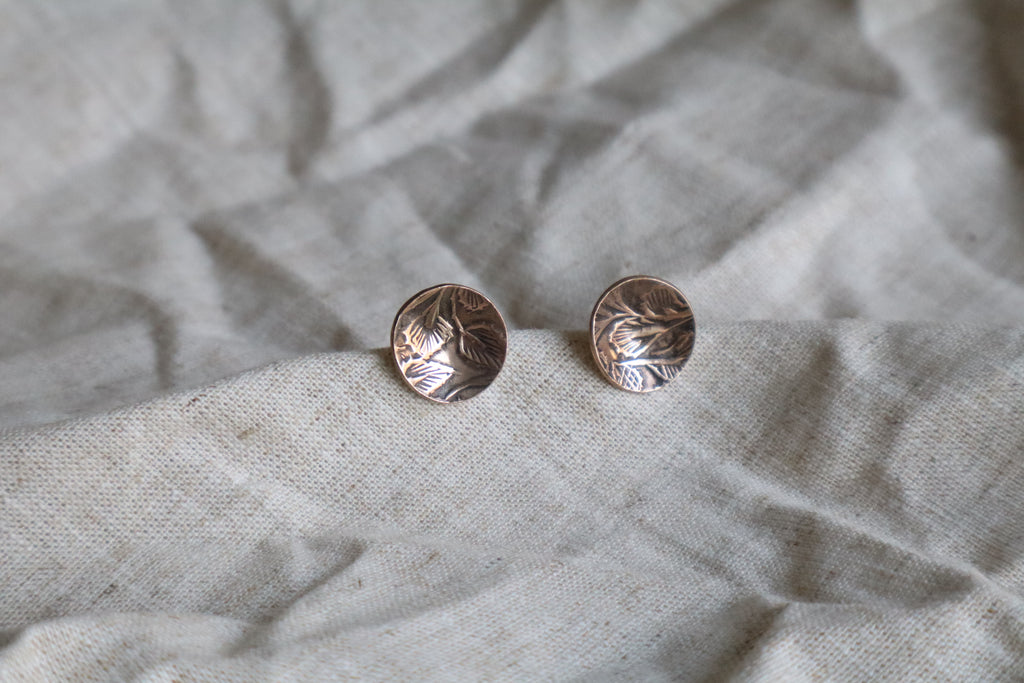 The Cove Studs are small but sculptural, with a soft scooped form that catches the light. Each pair is hand-cast in bronze and finished with a leafy pattern, giving them an organic, textured surface. With sterling silver posts for everyday comfort, they’re an easy piece to wear on their own or layered with other earrings for a more collected look.