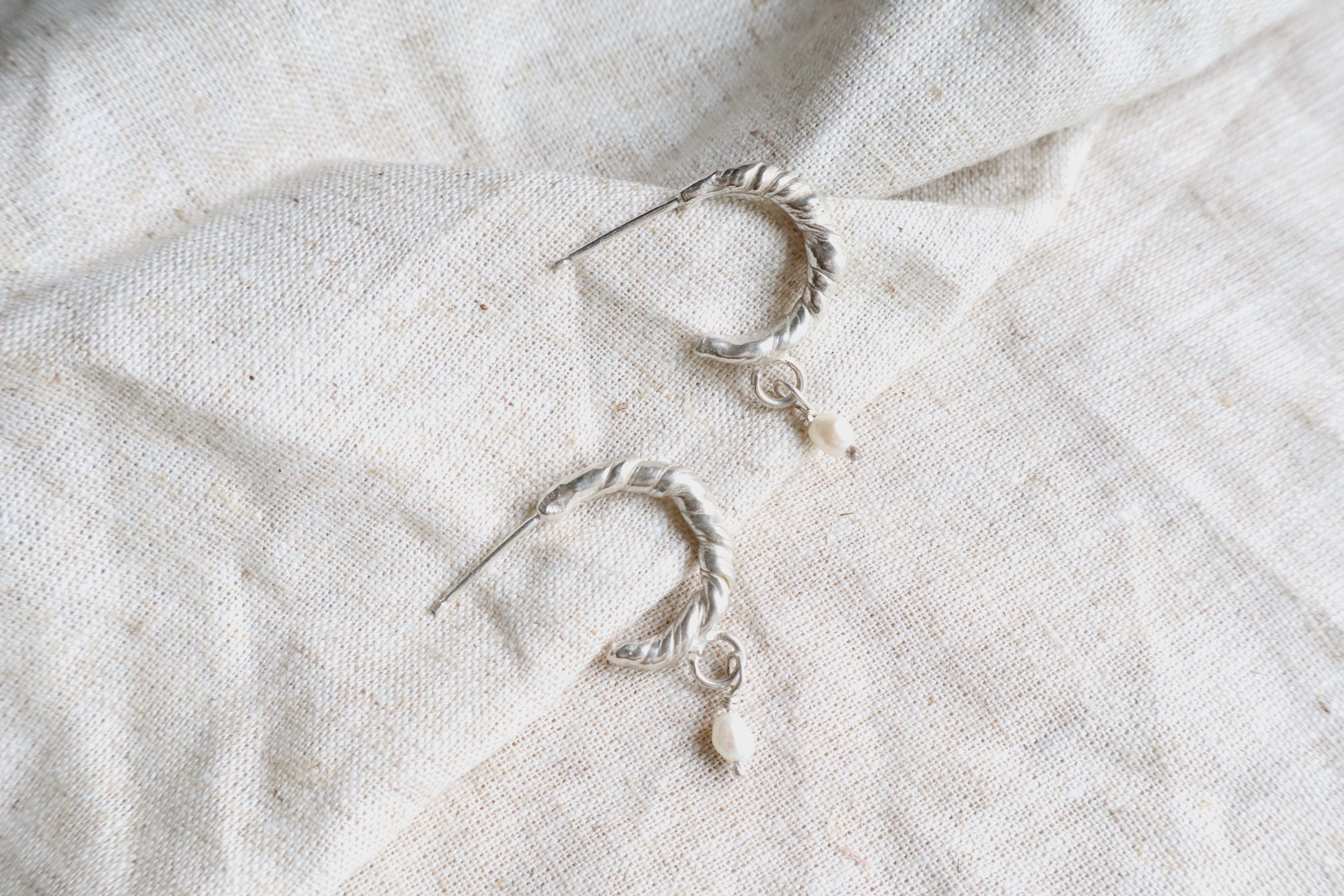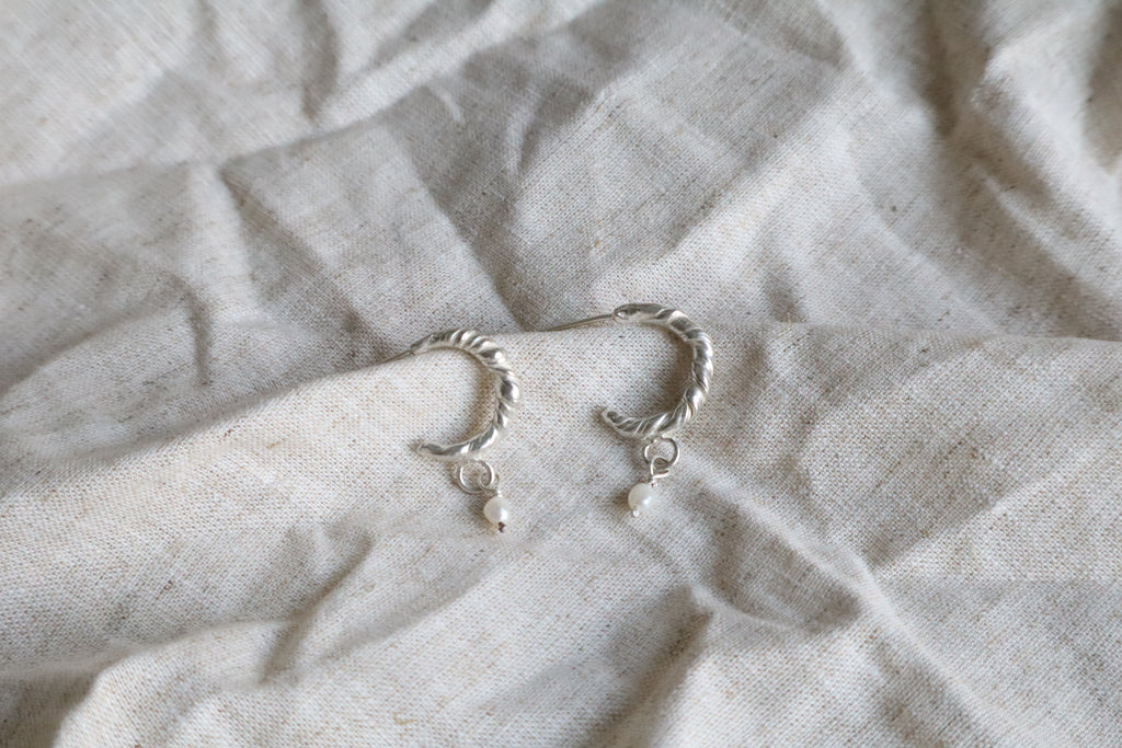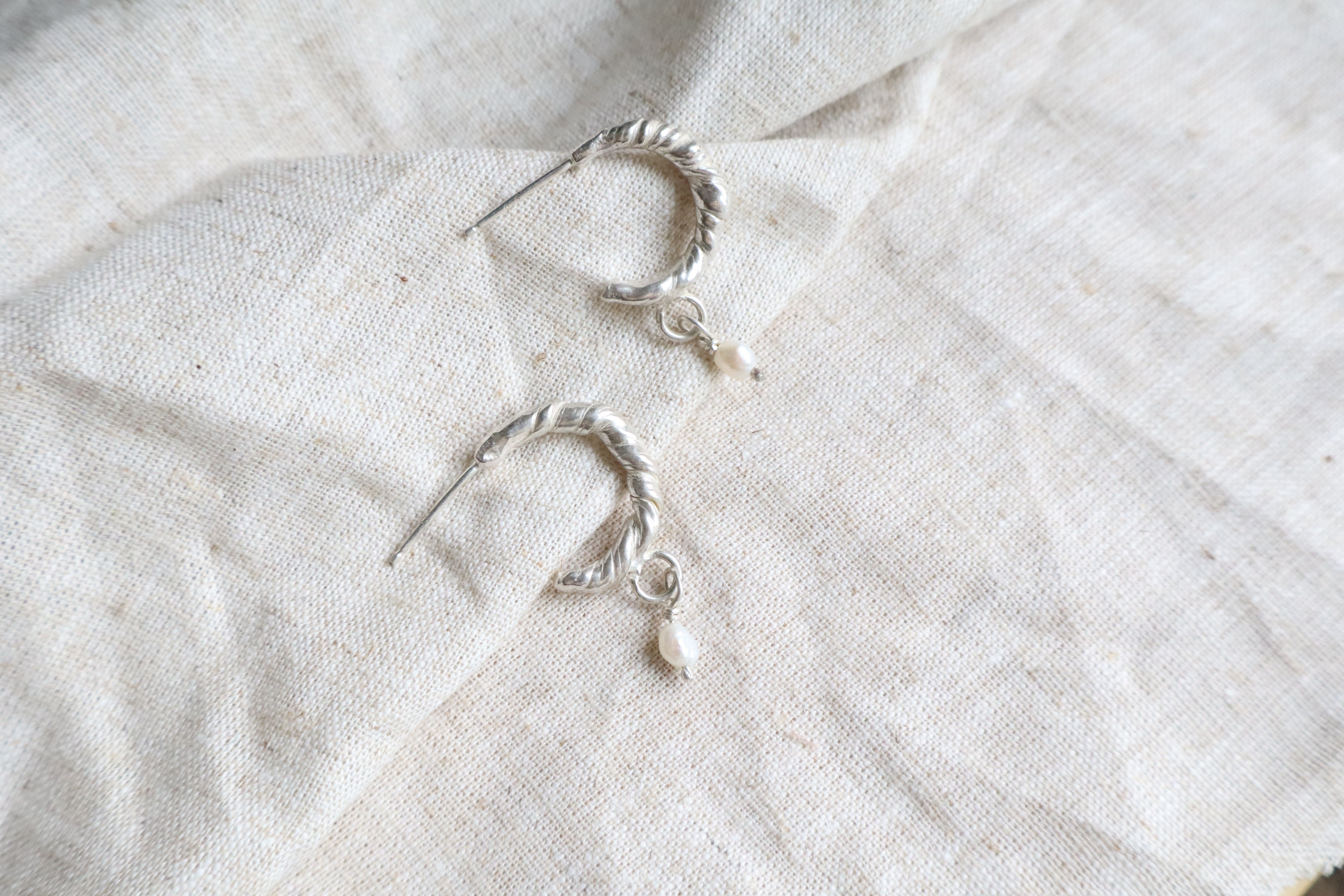 These earrings have a laid back refinement - a variation on the Vienne design, this pair features a freshwater pearl set against the textured, hand-formed shape. Cast in sterling silver each earring is unique, with a balance of raw, organic form and the smooth glow of pearl. A sculptural piece that feels understated and cool.