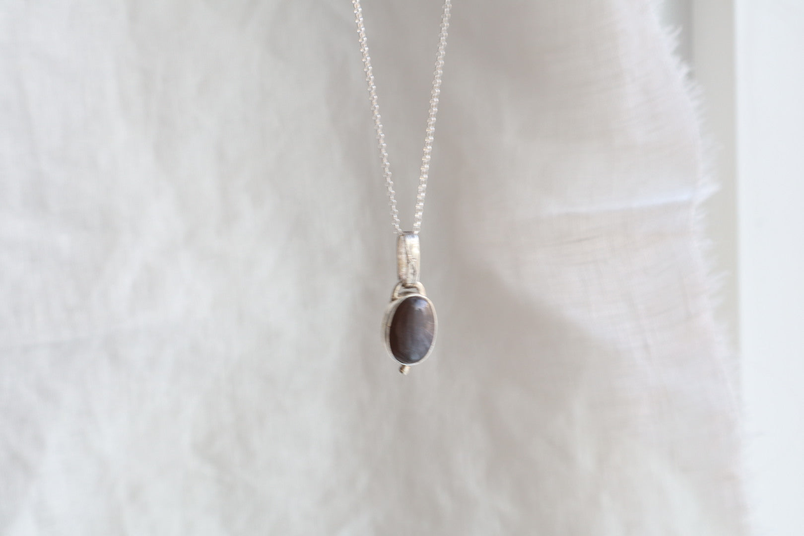A soft grey moonstone shimmers gently in a simple sterling silver setting, its natural glow catching the light with quiet elegance. The Faye Necklace is delicate, evoking fleeting moments of magic and making it a beautiful piece to wear alone or layer with other cherished treasures.