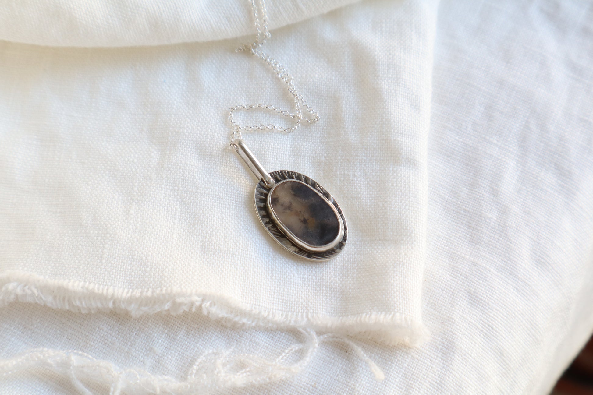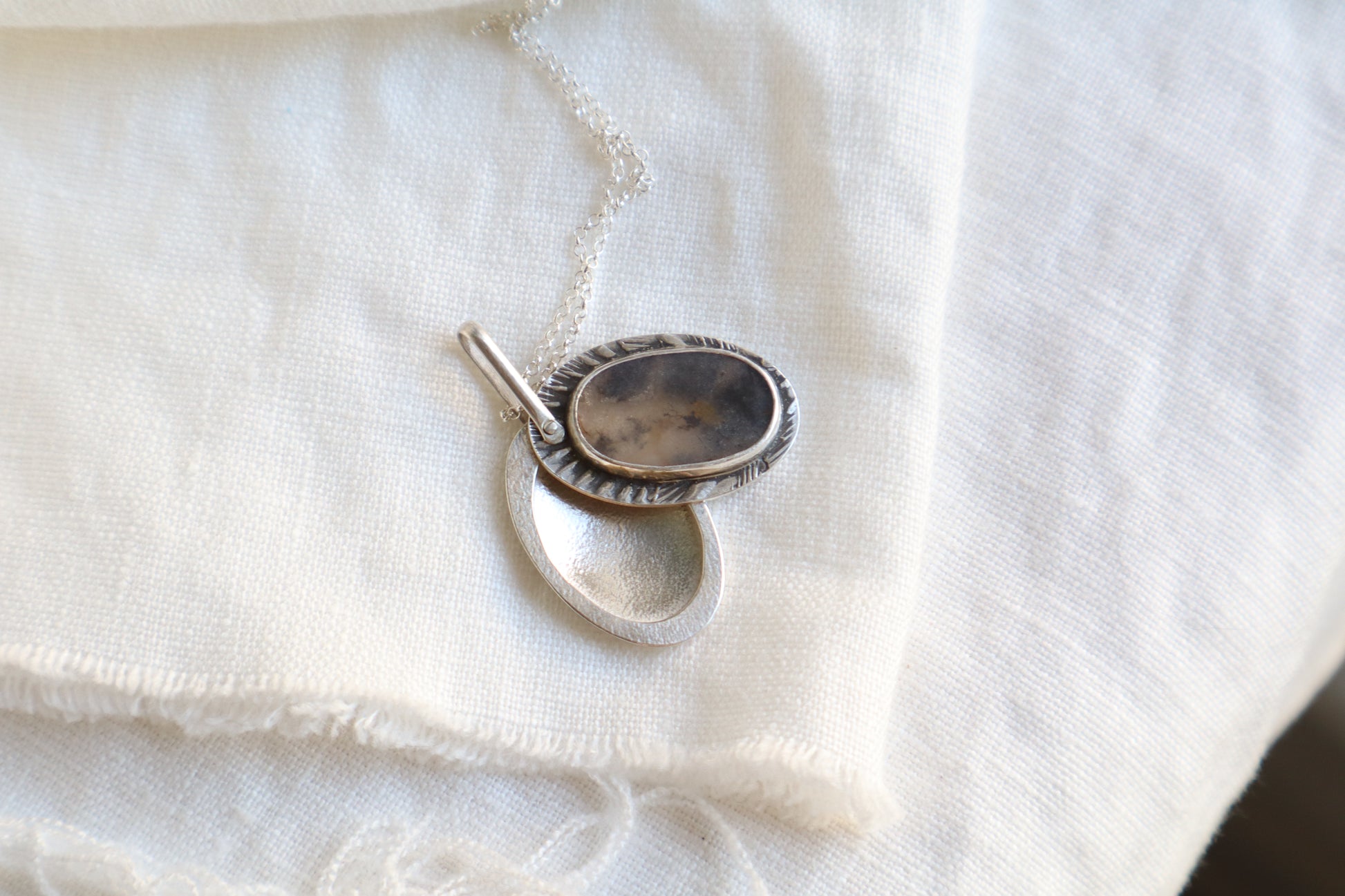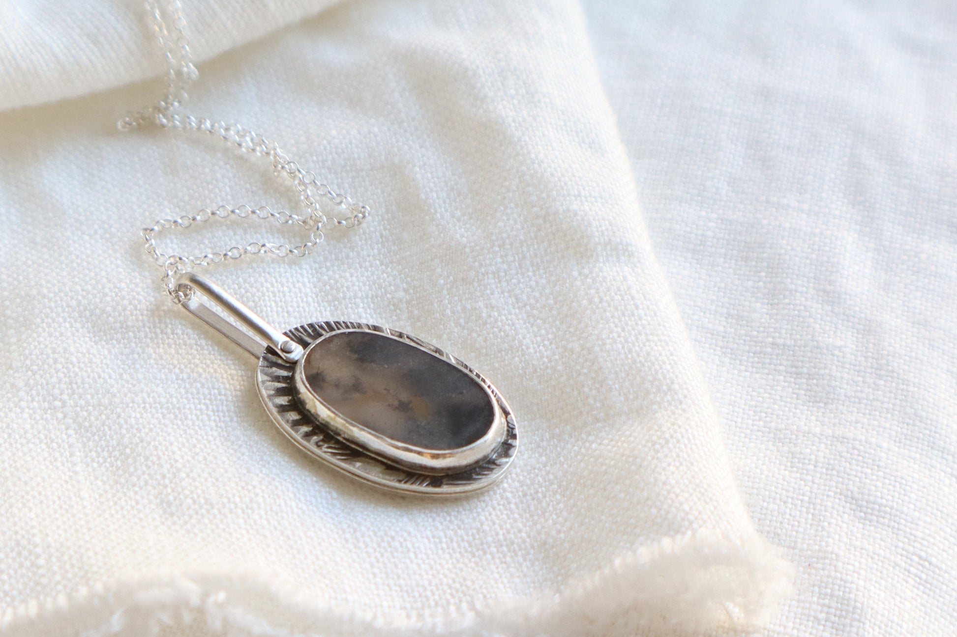 The Alder Locket is crafted in sterling silver and set with a natural brown and cream dendritic agate. It’s a stone formed over thousands of years as minerals settled within it, creating delicate, earthy markings that resemble the lines of a landscape.
