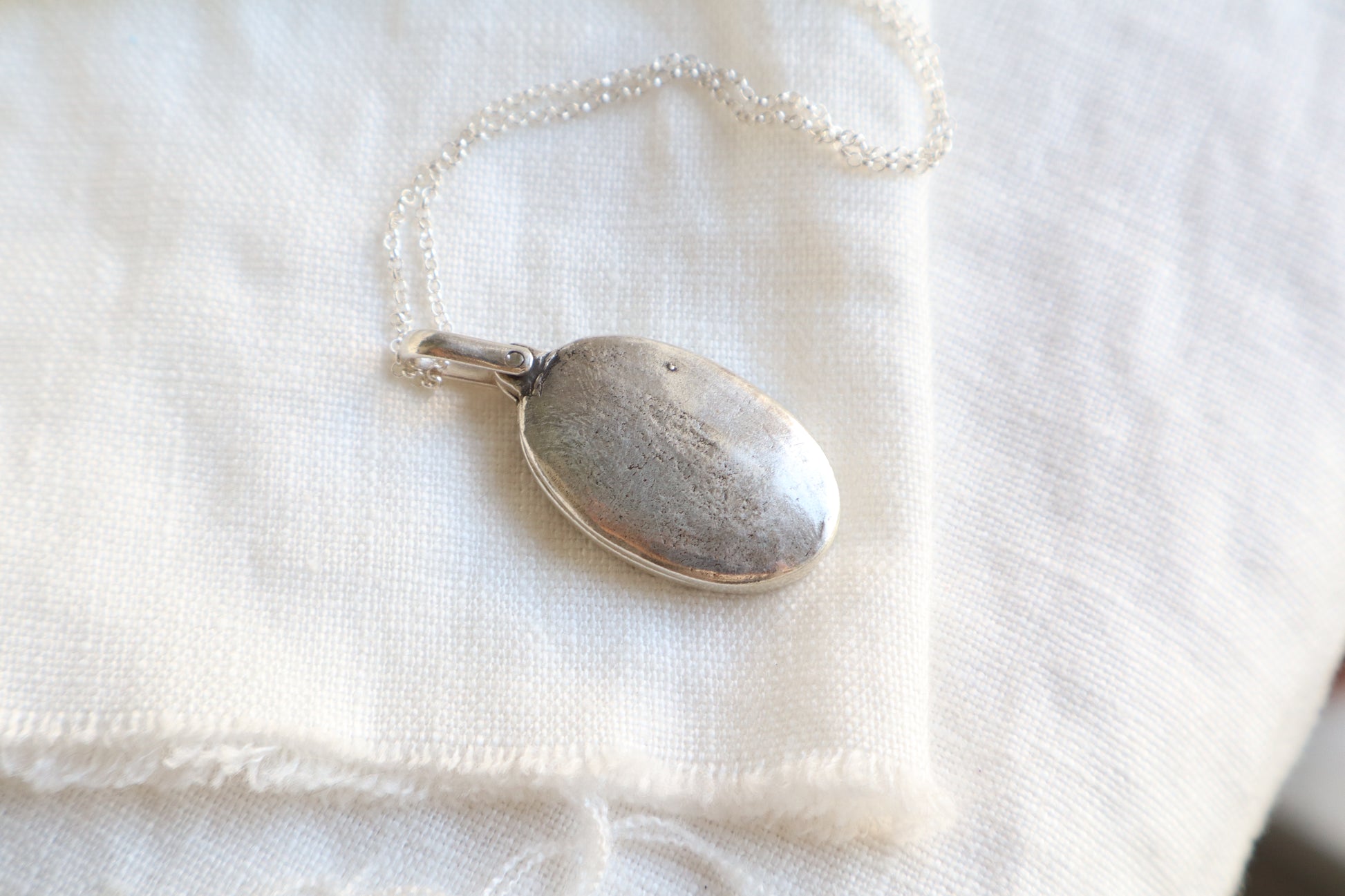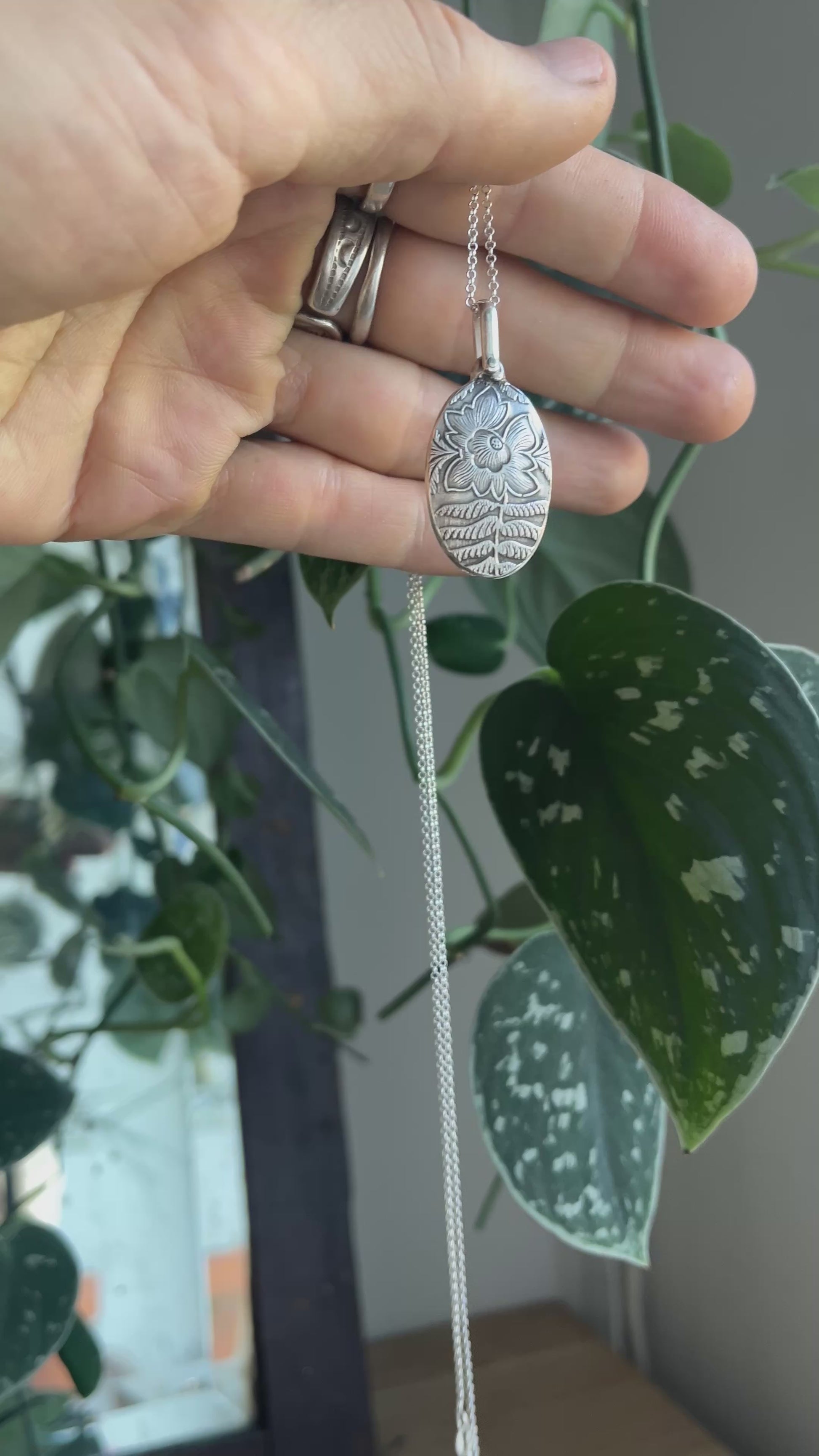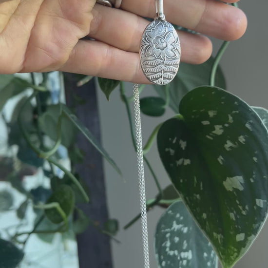 Handcrafted in sterling silver, the Aster Locket was first carved in wax before being cast into its oval form. Its subtle floral motif evokes growth and beauty, while the textured ,hand carved interior holds a small photo or token close to the heart. A softly aged finish enhances the pattern’s depth, giving it a timeless elegance that complements other cherished pieces.
