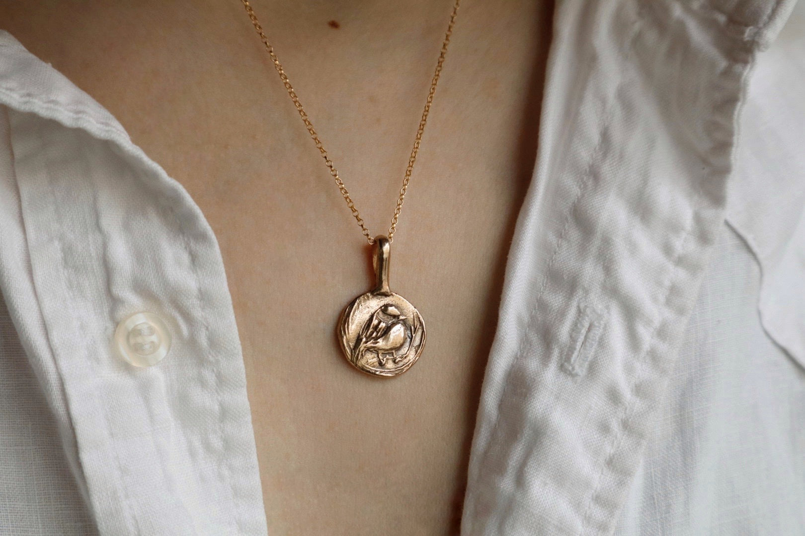 Handmade by first carving in wax and then cast in bronze, it has a nice weight to it and is made to be worn daily. Comes on an 18” 14k gold filled chain, or choose the pendant on its own and wear with your own favourite chain.