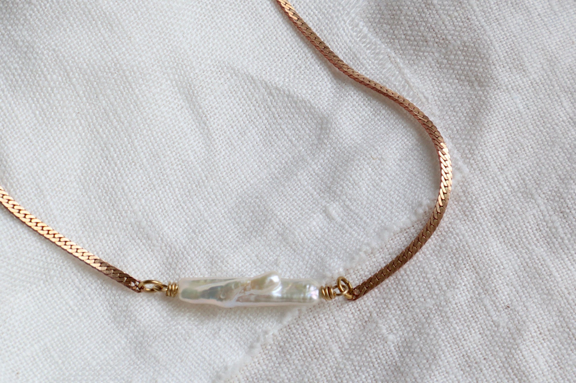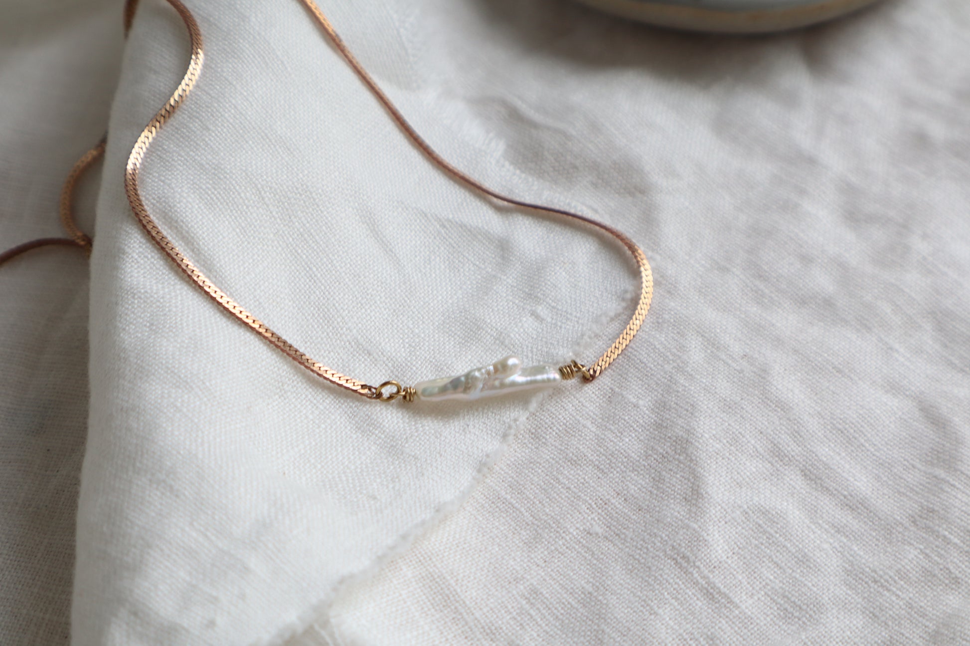 A slender freshwater stick pearl creates a graceful, organic line—softly irregular in the best way. Paired with vintage brass, the Drift Necklace adds a subtle glow and a bit of character to your neckline. Its shorter length sits beautifully with open collars and makes an effortless layering starter.
