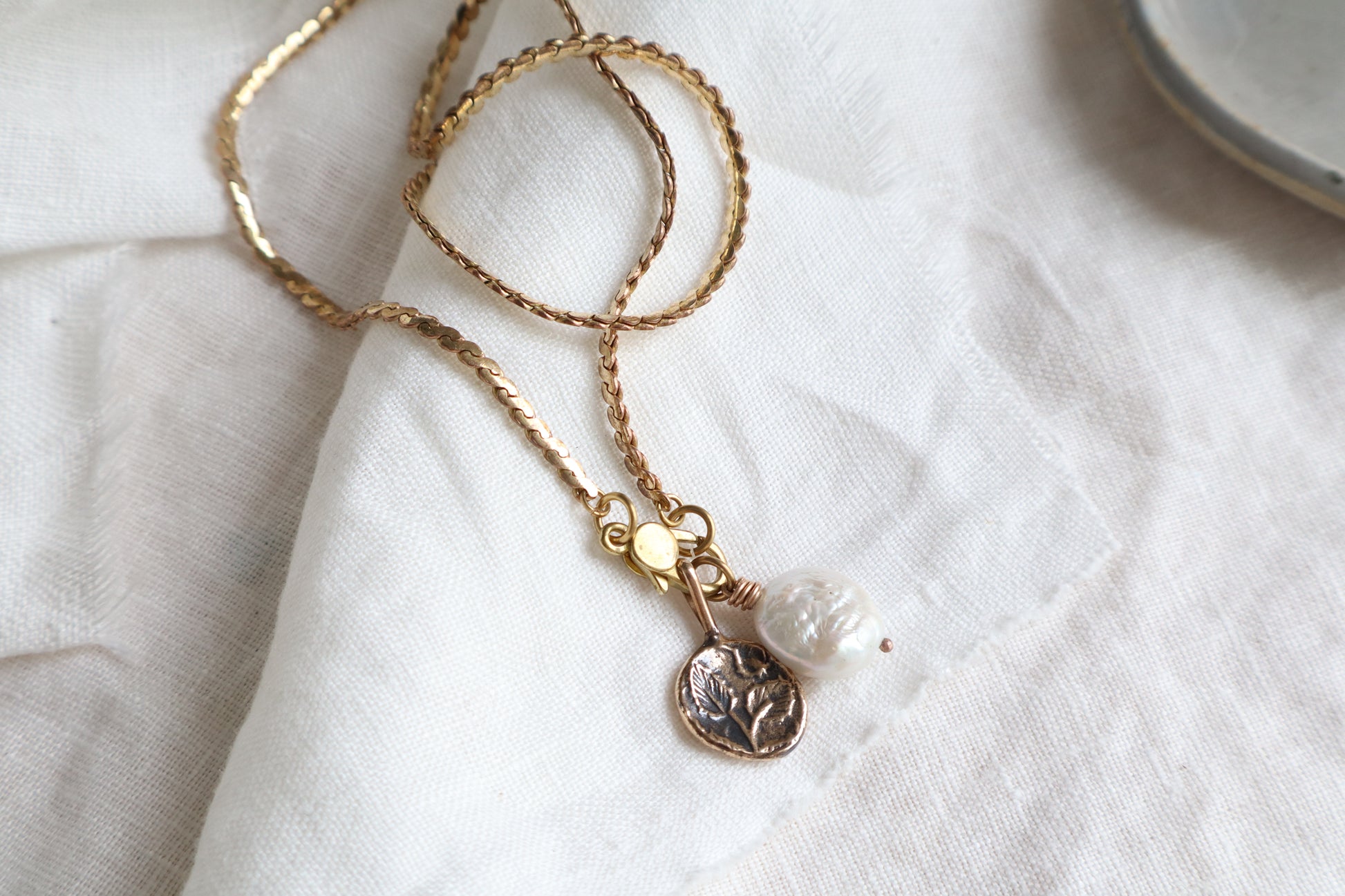 A thoughtful pairing of two meaningful elements. A bronze Reverie pendant and a luminous freshwater pearl, brought together on a front-clasp vintage brass chain. The Heirloom Duo Necklace feels personal and expressive, with each pendant adding its own story and presence. You can also add your own charms into the mix. Making it extra personal!