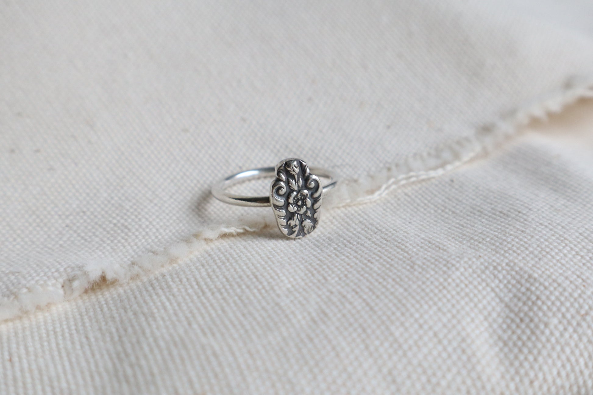 Pretty classic, cool and modern, all rolled into one. Alma would make a nice every day ring to wear with your other favourites or solo. A little piece of history - the floral pattern comes from a vintage sterling silver spoon, ready to be part of yours. One of a kind so its just for you!