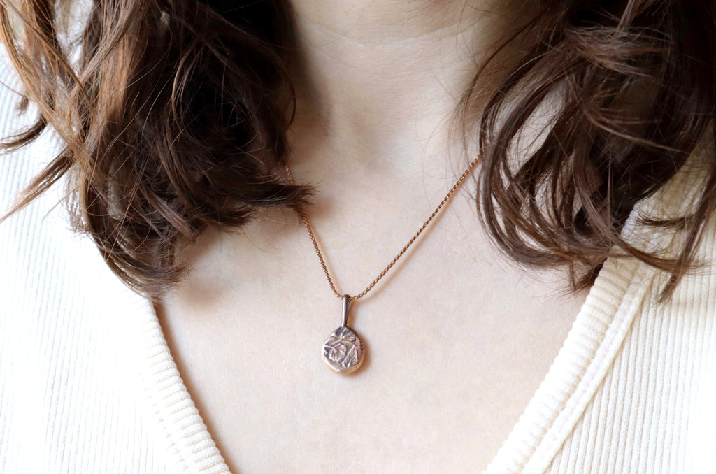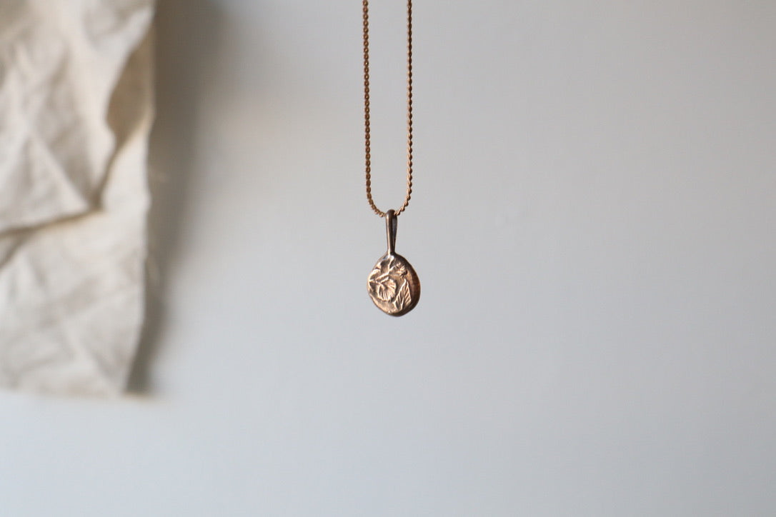 An instant favourite! A small bronze pendant, first starts as wax and is shaped by hand, with a delicate leaf impression that feels both earthy and timeless. It is then cast in bronze capturing all of the pendants tiny details and charm. Suspended from an 18" vintage brass chain, it’s an easy everyday piece that layers effortlessly with others.
