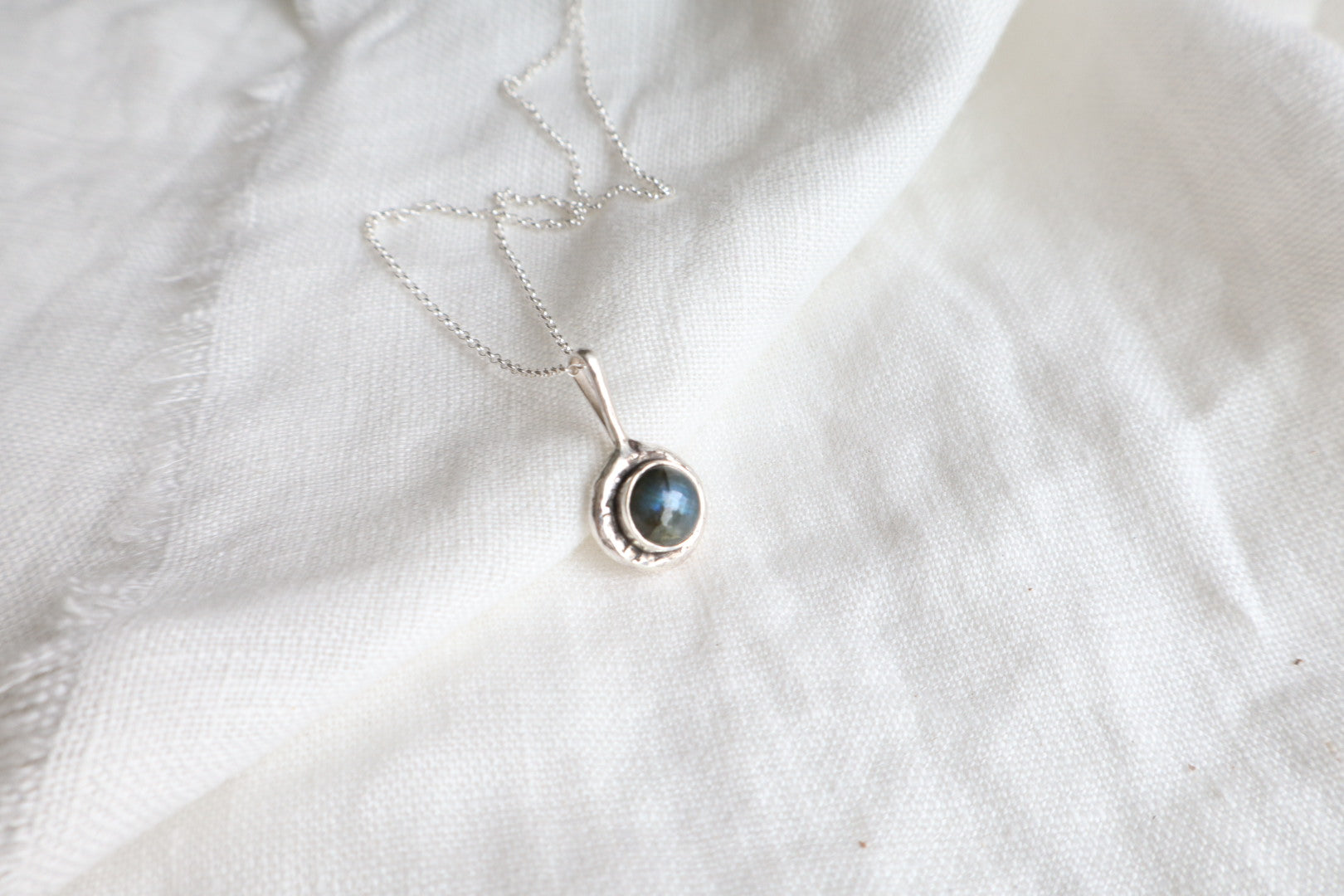 No two alike. A small hand textured silver pendant with a set labrodorite stone, that is simple and one of a kind. The floral motif is a reminder of the cyclical nature of life, and of being connected to nature. The labradorite stone can be associated with protection, inner strength, and intuition. Wear it solo or layered as a touchstone of where you've been or where you are headed.