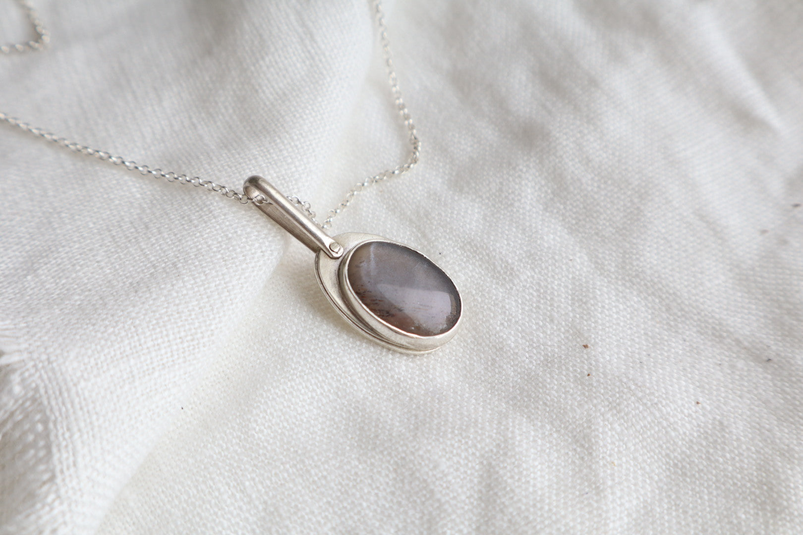 The Vale Locket is crafted in sterling silver and set with a soft grey moonstone that catches the light in shifting tones of silver and smoke.
